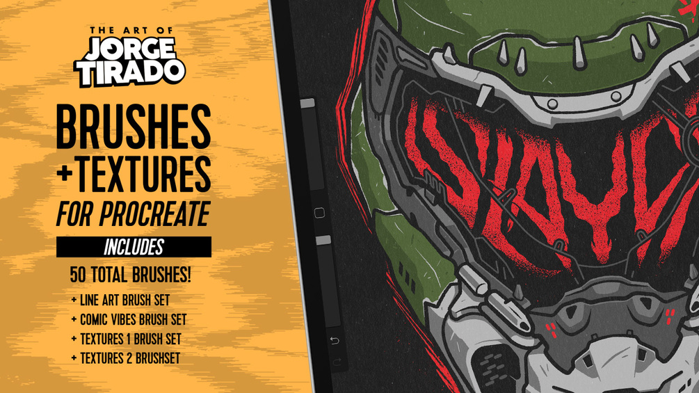 Welcome to my Brushes & Textures Brush set for Procreate. This includes 50 brushes that span from line art, comic shapes, and paper textures and distressing. Everything I use for my digital illustrations and tee designs.